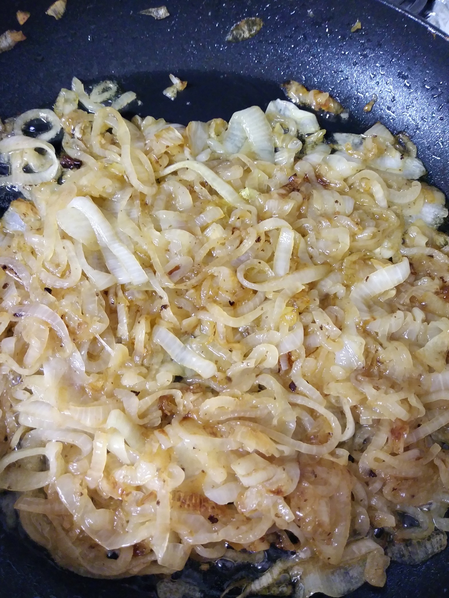 Get a pan ready on the stove, it doesn’t need to be super hot before you add oil into it, for this we’re going to start off on a medium temperature and then cook on medium-low for the remainder of this process. Use a low-heat oil (like olive oil) to give a light coating to the pan and add in your onions. Next you need to salt those onions… No, salt them some more. Salt it like the ocean. You know how putting salt on meats and fish can help draw out moisture so it can start the curing process? Same deal, we’re going to draw out moisture and the sweetness. If you’ve ever put salt on fruit (or salty additives like tajin) then you know what I mean by bringing out the natural sweetness.